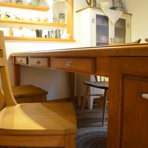 忙しく過ごす都心の生活を離れ、愛犬たちとともにくつろぎの時間を過ごす場所です。 引出しのとってはアンテイーク調のとってをつけ、テーブルにはランタン型のタイルを埋め込みました。 オーディオ機器はぴったりとおさめ、スピーカーを引出せるようにしました。