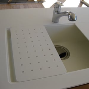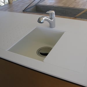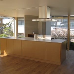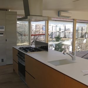 大きく開かれた窓から素晴らしい眺めの見えるアイランドキッチン。 真っ白なカウンターと人工大理石シンクが一体化してすっきりとした形に。