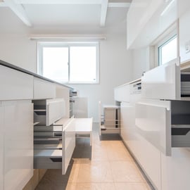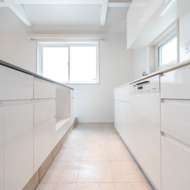 カウンターは、グレー色のサイルストーンを使い、ホワイトの扉と合わせて