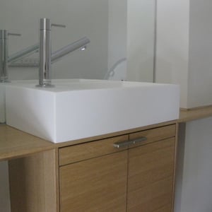 オークの突き板面材に、グレーの人工大理石カウンターをあわせています。
