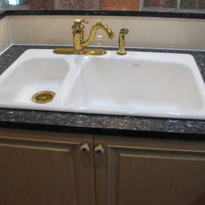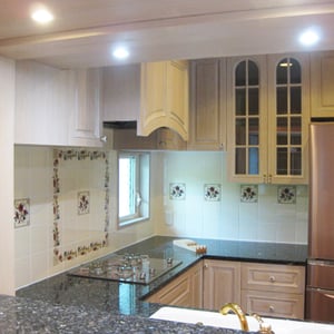 壁面に使用した花柄のタイルは国内では種類が少ないため、イギリスから取り寄せました。 カウンターは天然石ブルーパール、シンクと水栓はコーラー社のものです。